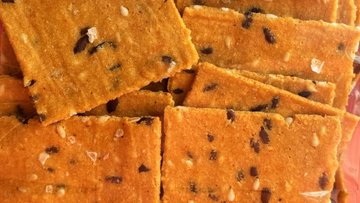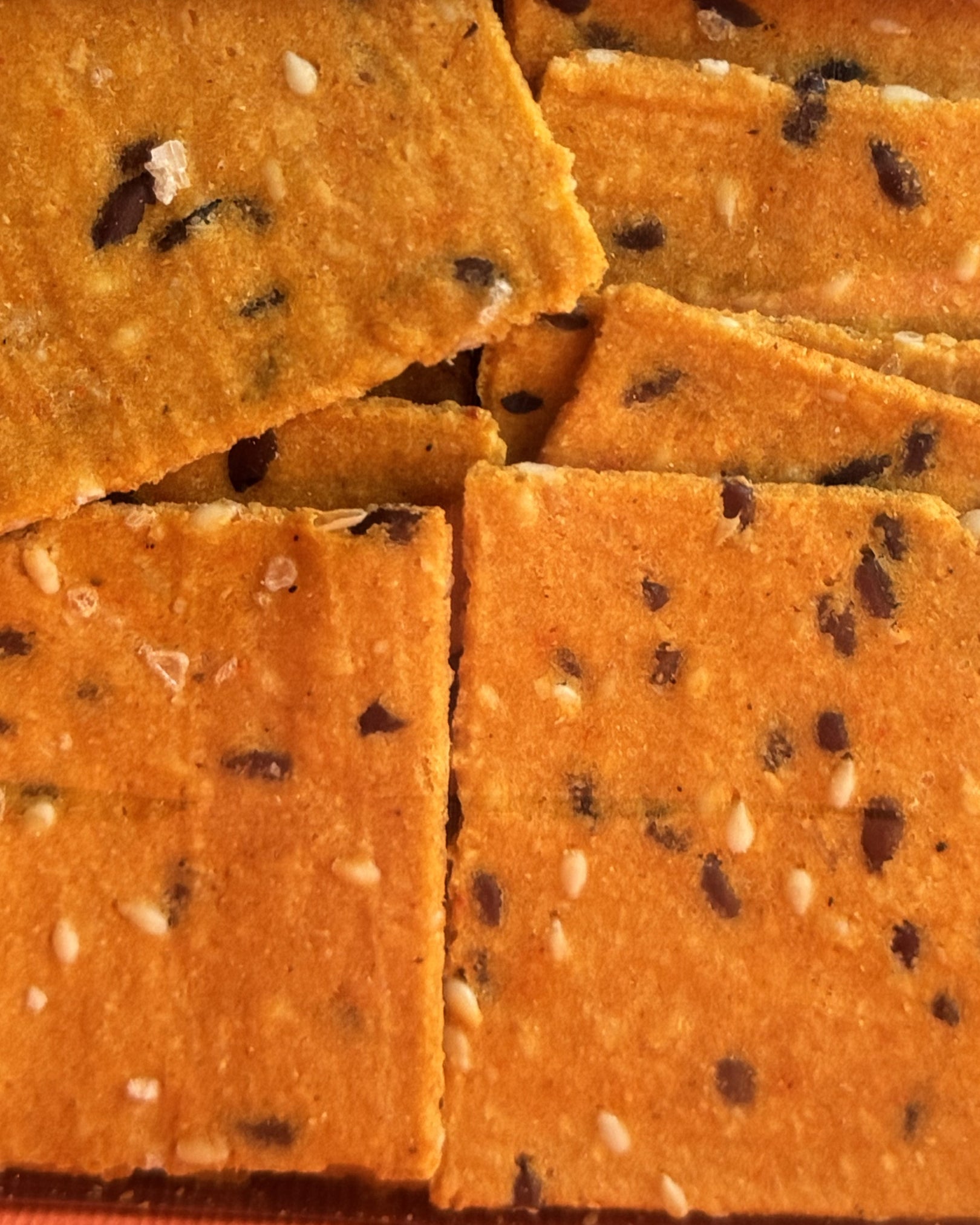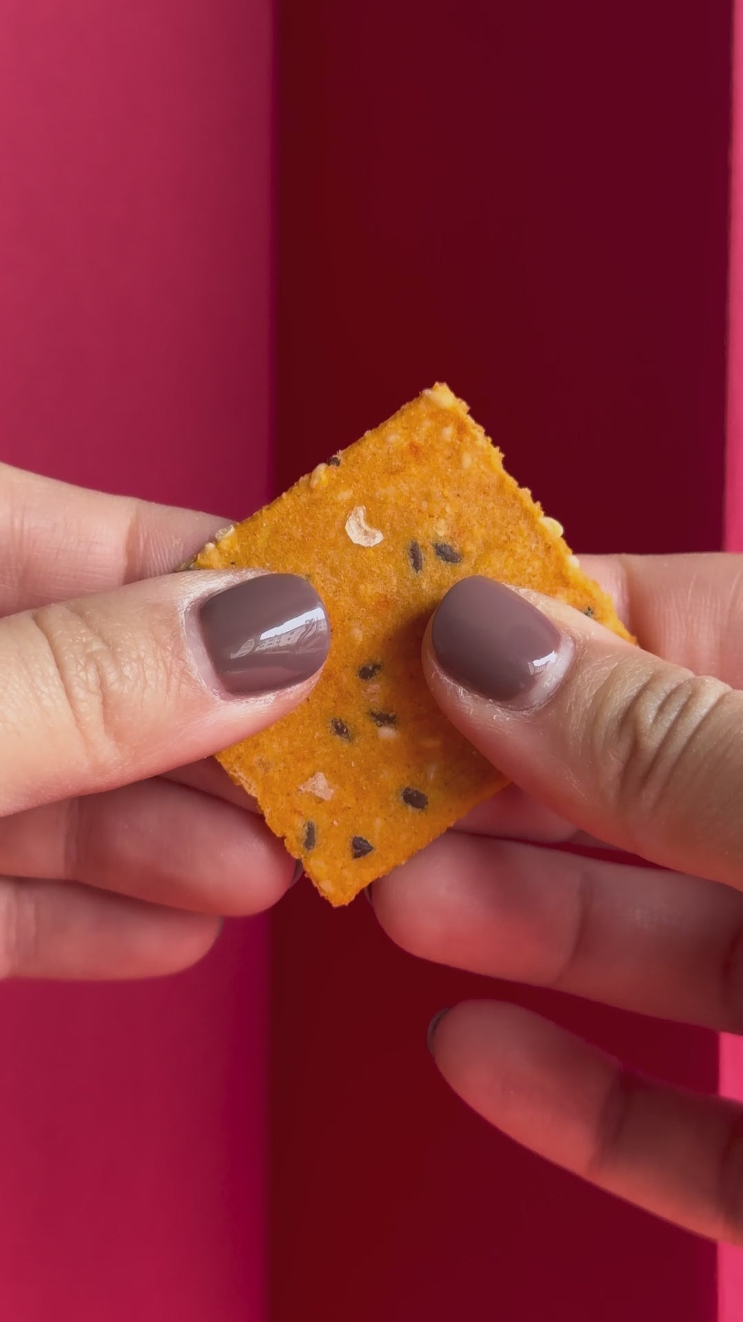 A salty, thin, and delightfully crunchy cracker, rich in flavor and naturally gluten-free. Structured by a bold mix of cracked pepper, sesame seeds, and flax seeds, each bite finishes with the bright, satisfying crunch of Maldon sea salt. A perfectly balanced snack—simple, addictive, and completely wheat-free. Another win!