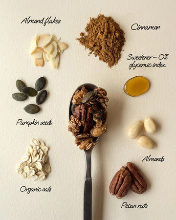 Simple, wholesome ingredients create pure flavor. Crunchy organic oats, aromatic cinnamon, Sicilian almonds, and fragrant pecans come together in this gluten-free, sugar-free granola. A delicious, guilt-free snack crafted with care in Oradea for your everyday enjoyment.