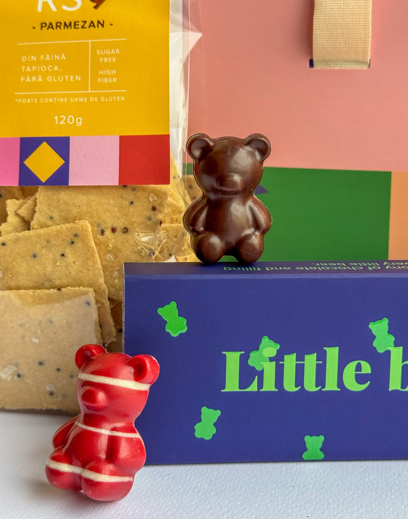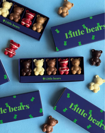 O colecție de 5 ursuleți din ciocolată belgiană, fiecare cu un interior surprinzător: căpșuni vibrante, fistic fin, caramel sărat, cireșe negre și banane cremoase.