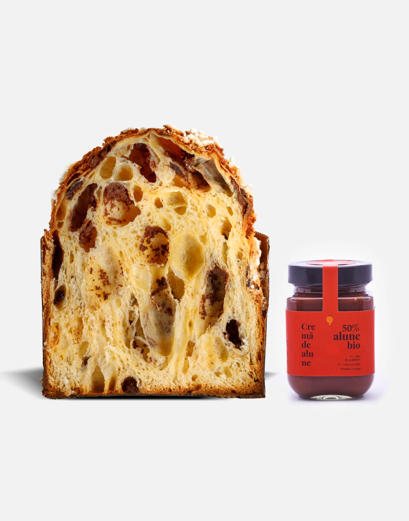 Panettone artizanal cu gust dens de ciocolată cu lapte și note citrice, alături de o cremă tartinabilă cu 50% alune bio, cacao fină și vanilie de Madagascar. Un duo creat pentru cei care știu că plăcerea adevărată stă în detalii.